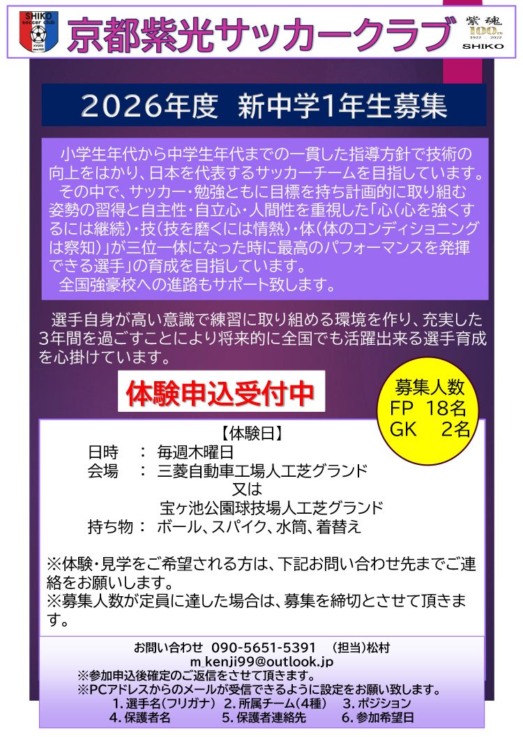 京都紫光サッカークラブは1922年に京都紫光クラブとして創立された京都のサッカークラブ(サッカー少年団)です。